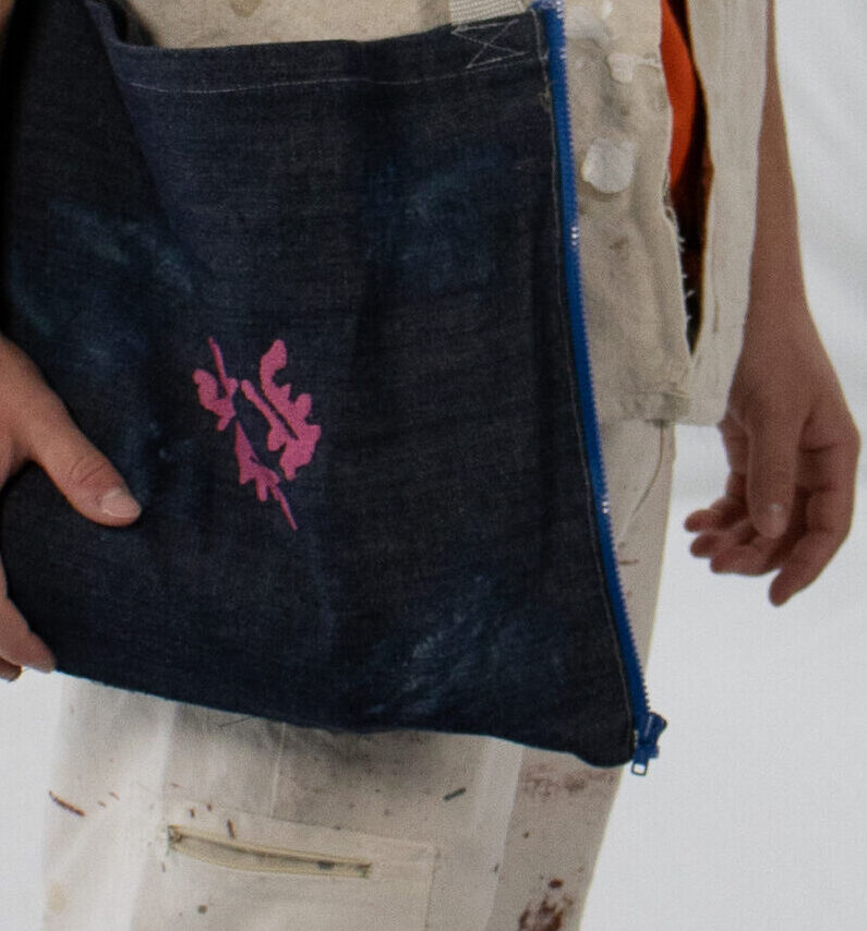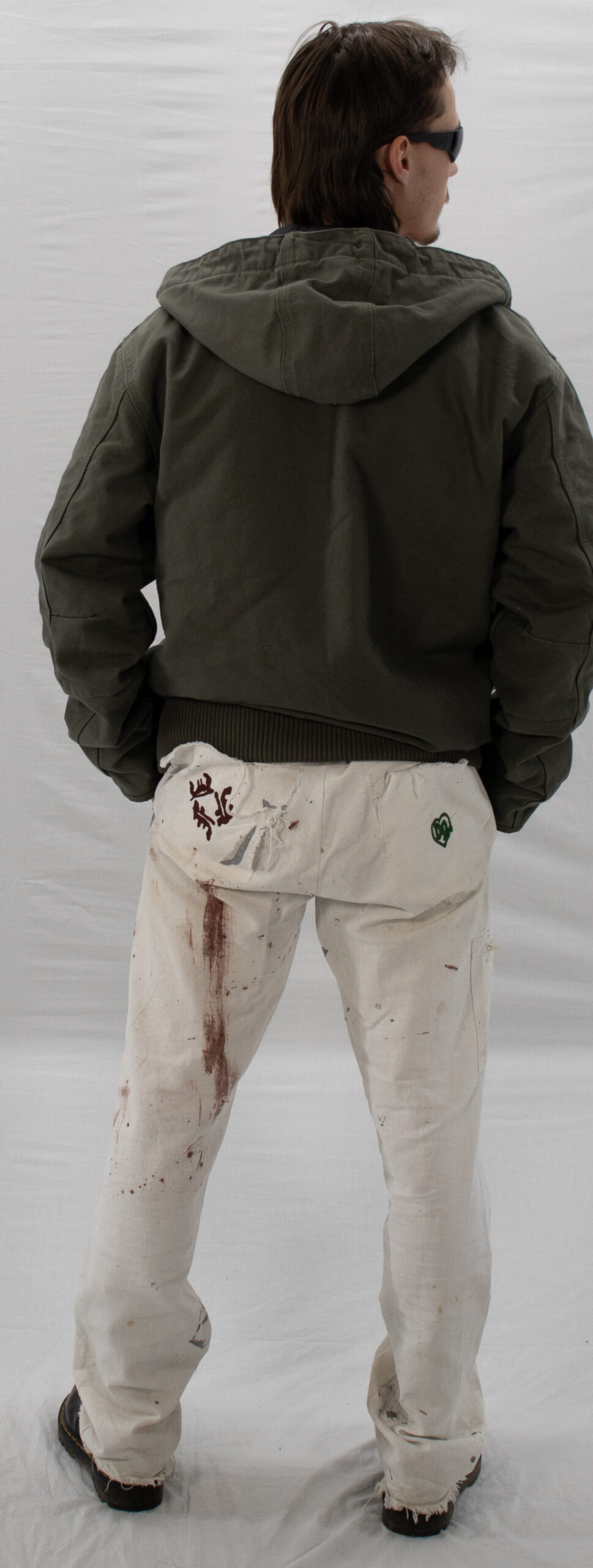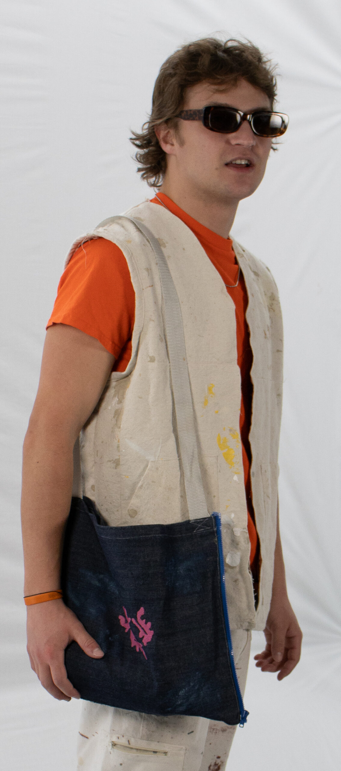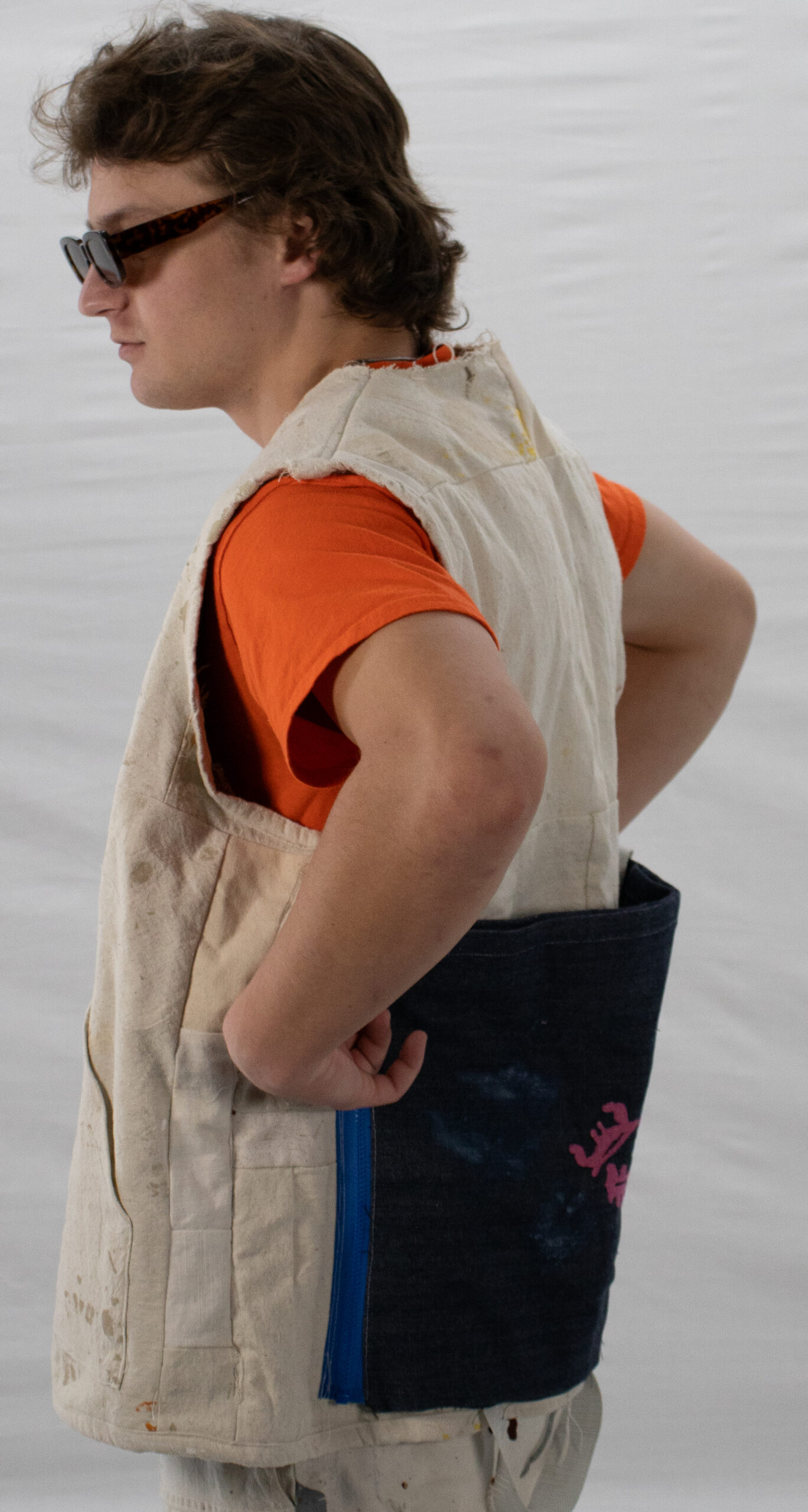 The collection featured two unique outfits. The pants and vest were crafted from my grandpa’s old stained painting drop cloth from painting his rentals. The vest, made from scraps of the pants, featured a zip-off bag on the back inspired by the need for more pockets. The sweatshirt, embodied personal significance and creative expression, featuring a design drawn by my girlfriend and transformed into a garment by me.