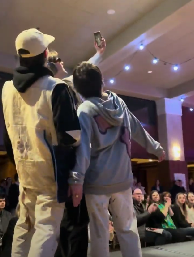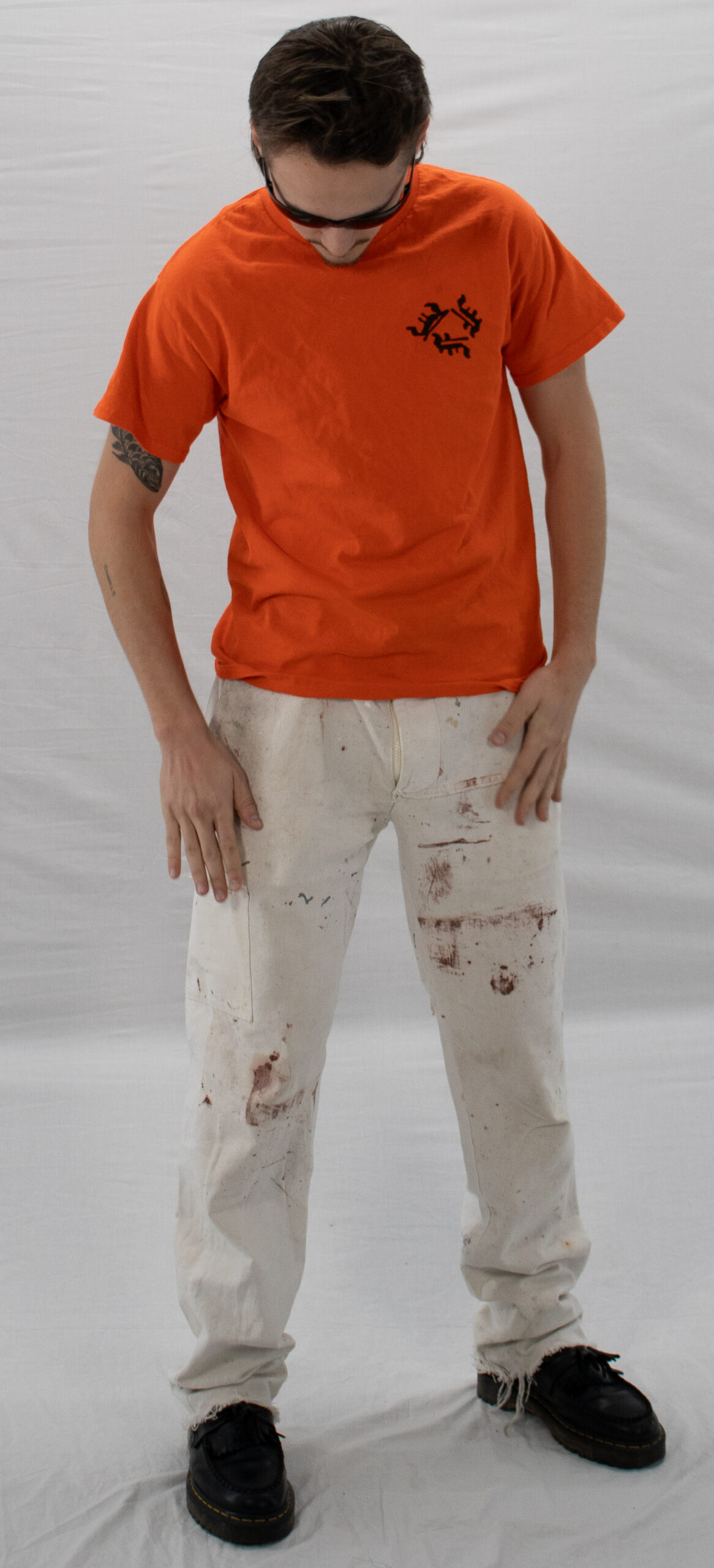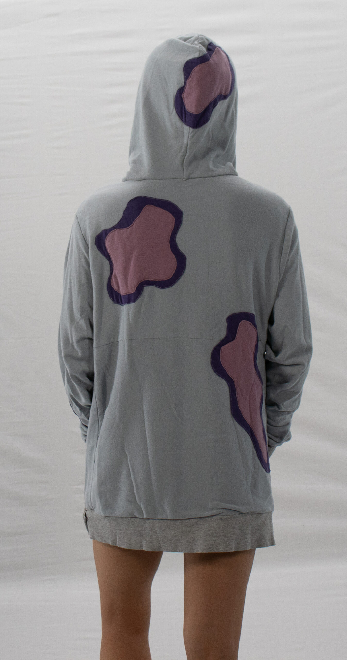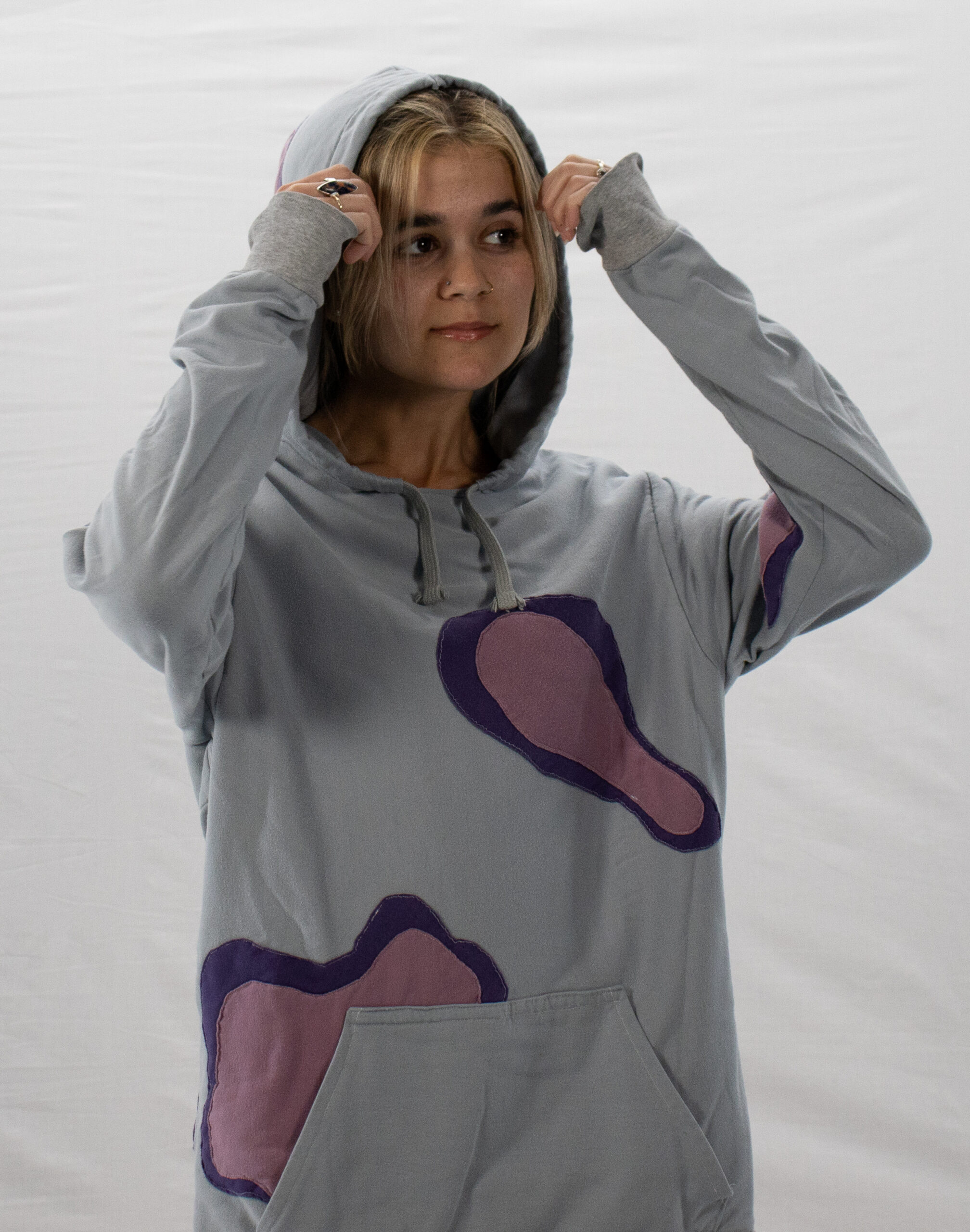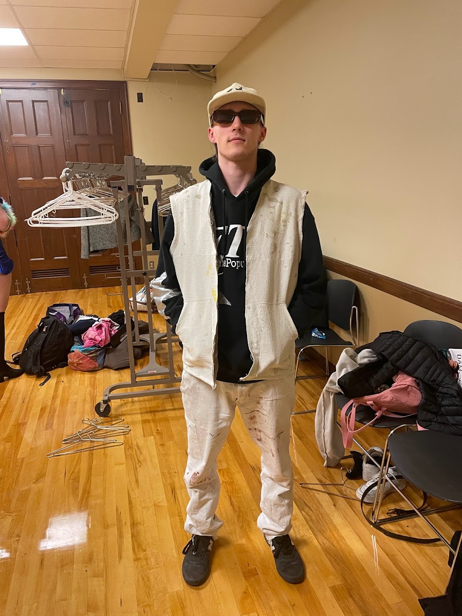 The collection featured two unique outfits. The pants and vest were crafted from my grandpa’s old stained painting drop cloth from painting his rentals. The vest, made from scraps of the pants, featured a zip-off bag on the back inspired by the need for more pockets. The sweatshirt, embodied personal significance and creative expression, featuring a design drawn by my girlfriend and transformed into a garment by me.