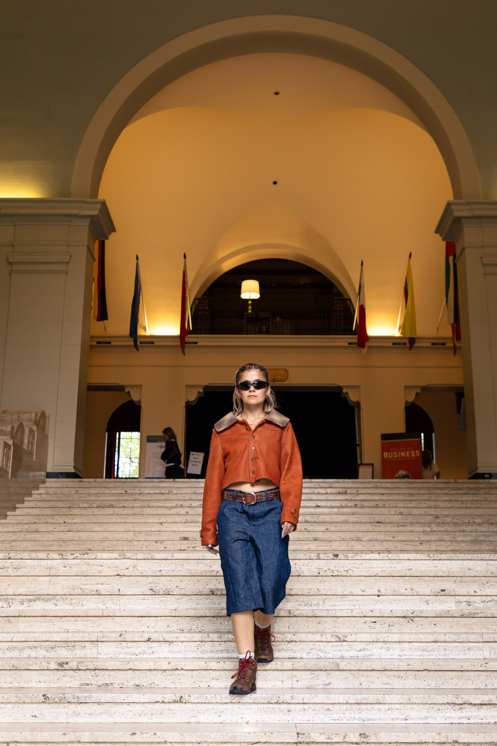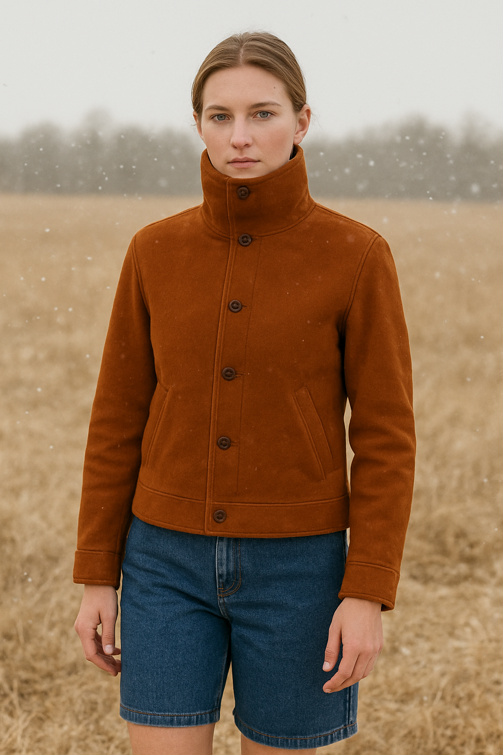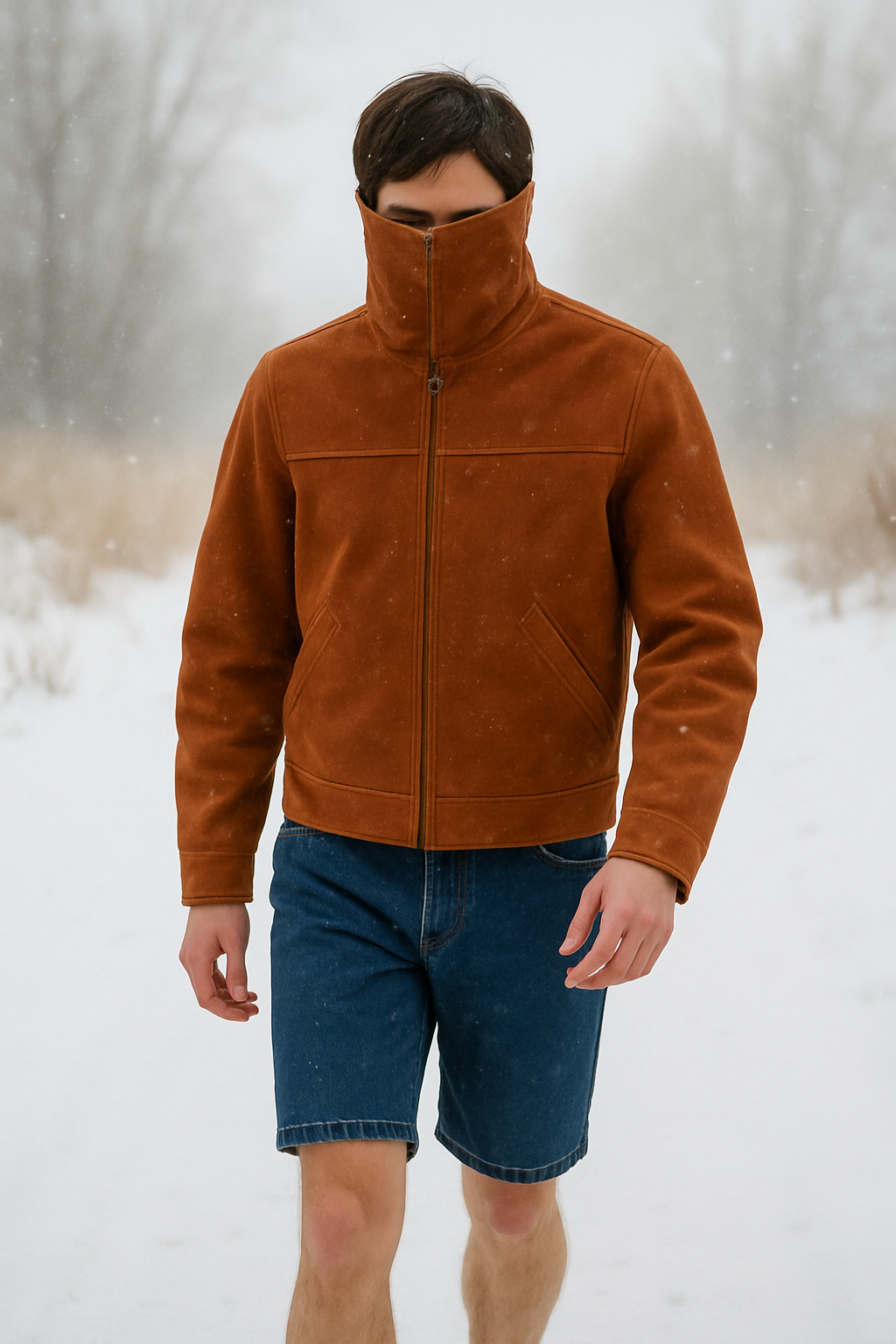Shrouded — Built to handle the elements, this look mixes durability with small functional details that make a difference. The jacket is made from 12oz deerskin, giving it a strong, lived-in feel that’ll only get better over time. The extended collar snaps together to block out wind and rain, and antique brass closures tie into the rugged finish.